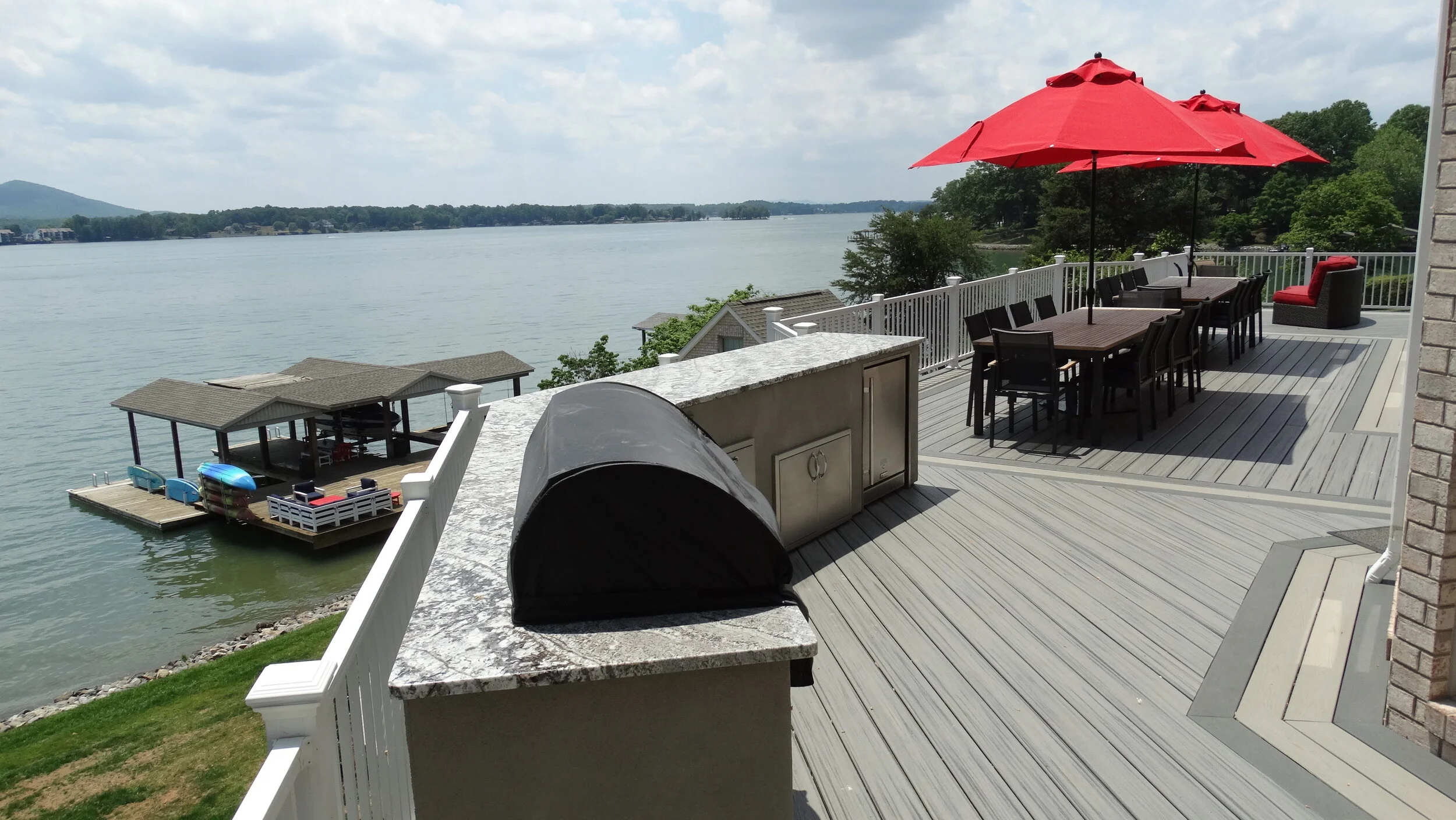 This 2,600 sq. ft dock offers multiple seating for 35 with wide water and mountain views.